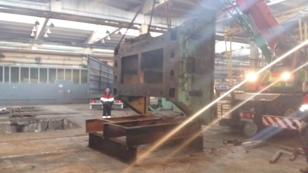 Погрузка части пресса усилием 500 тонн весом 63 тонны на изготовленное ложе под транспортировку