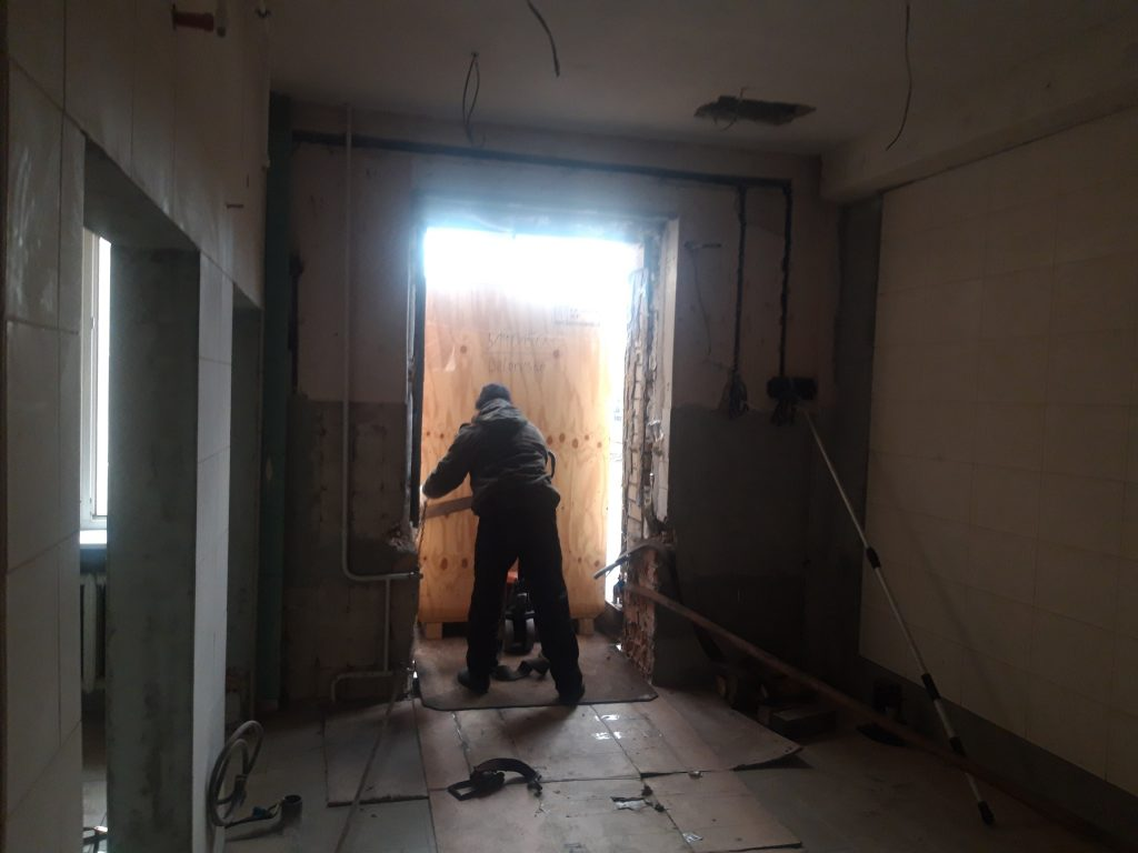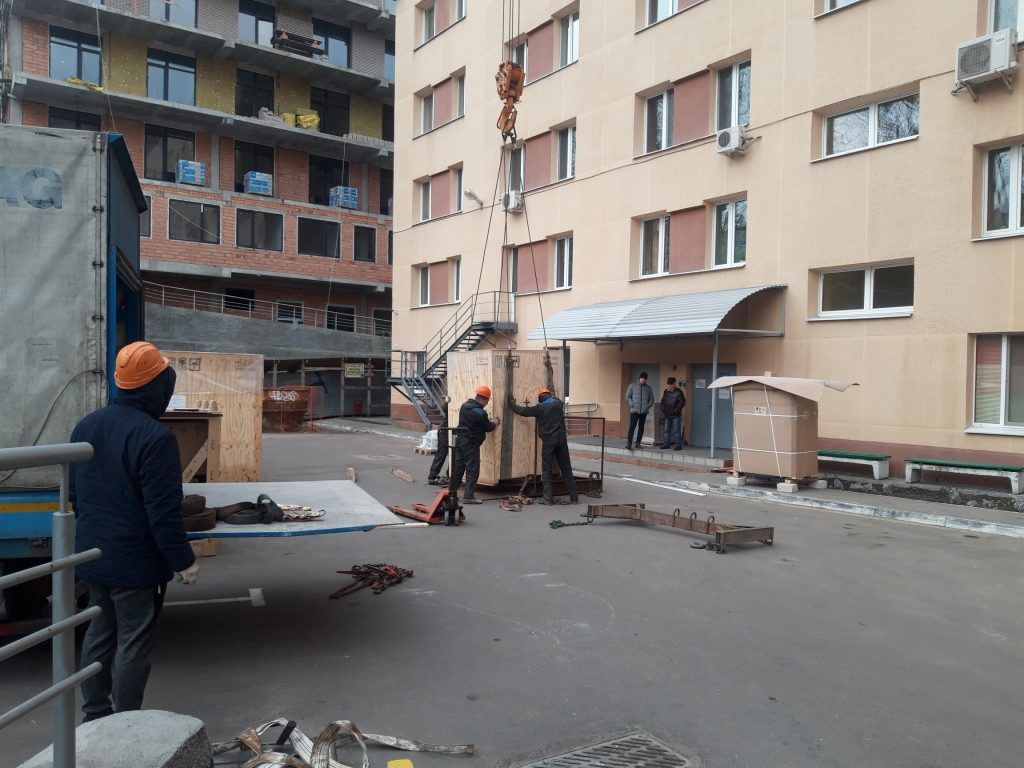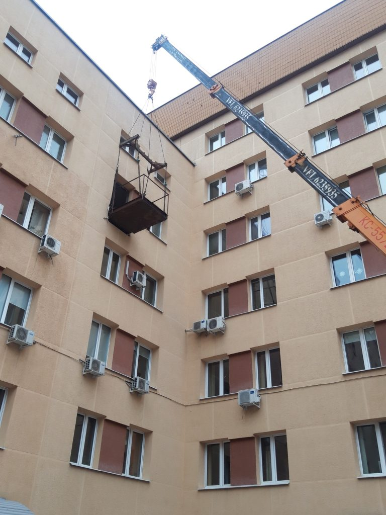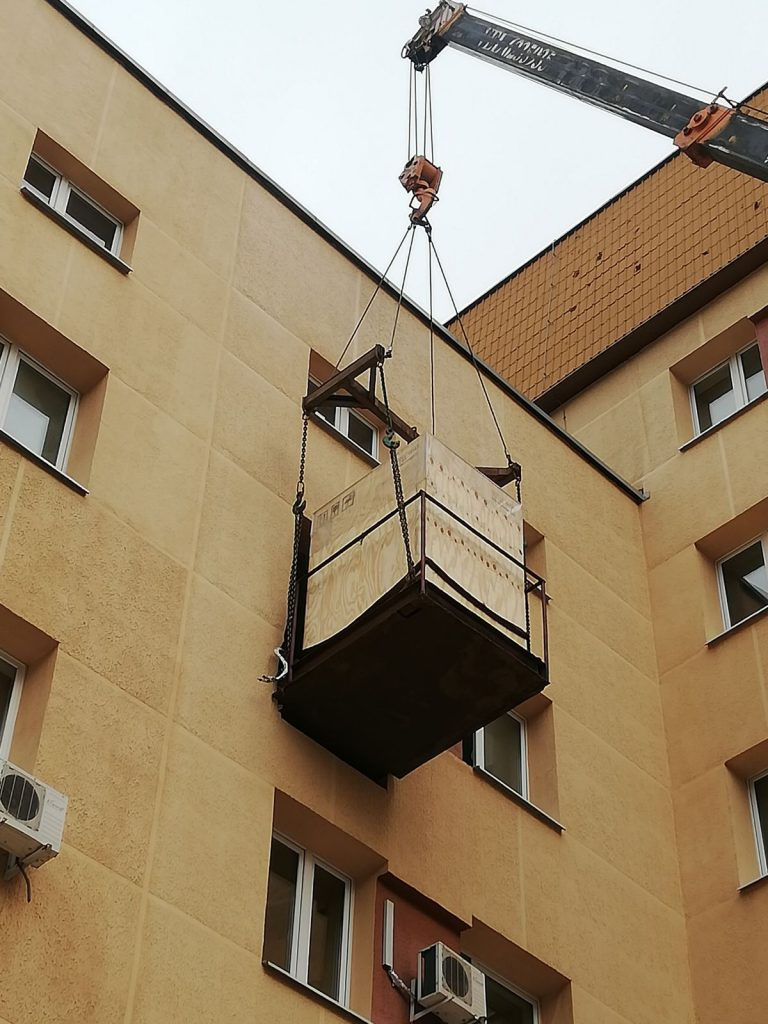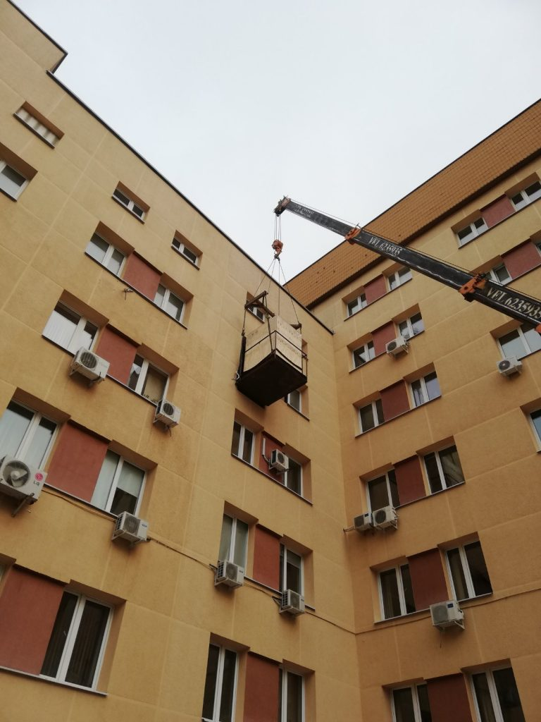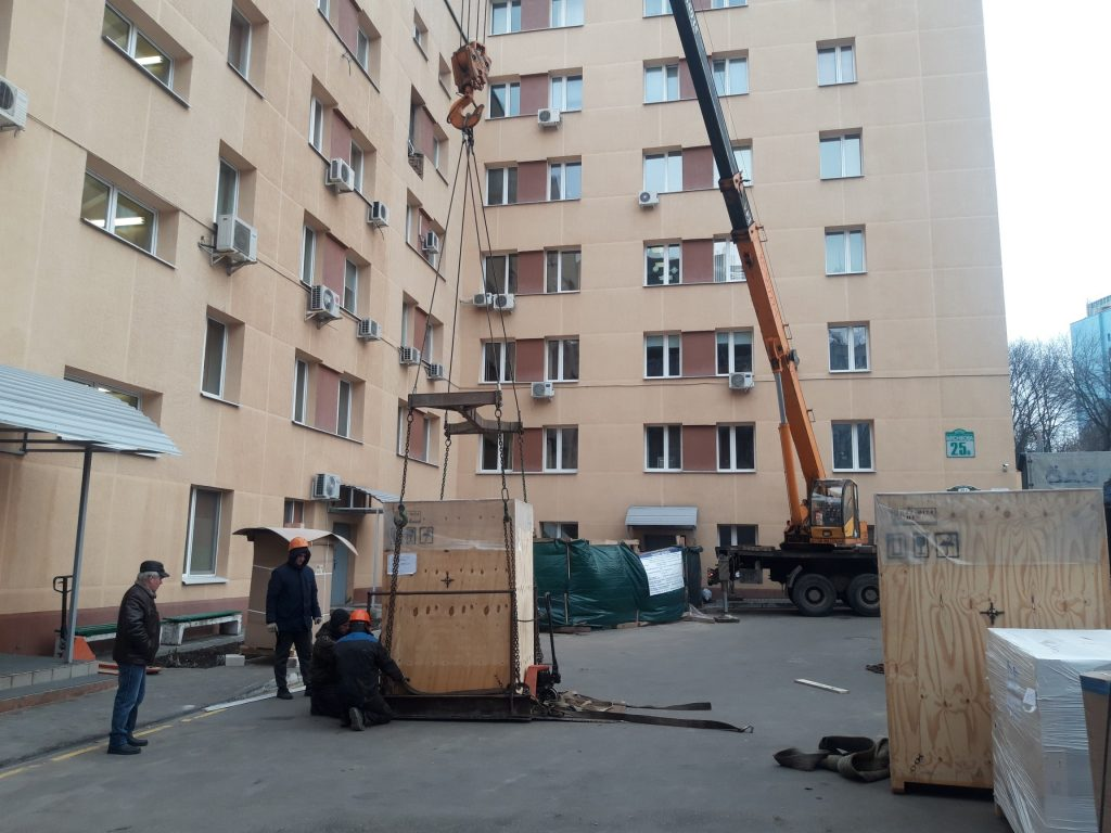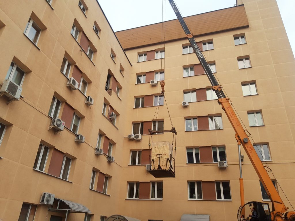 в окно поликлиники МВД. Мы изготовили специальную траверсу для подъема, демонтировали оконный проем и переместили 2 аппарата стерилизации весом 1 тонна каждый в помещение 5м этаже. Срок работ 1 день.