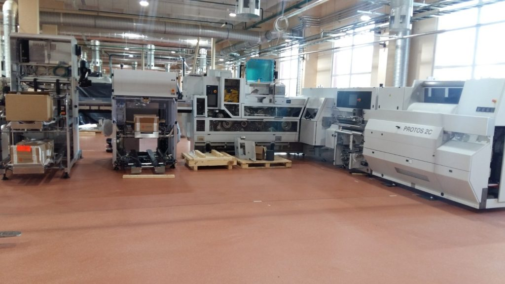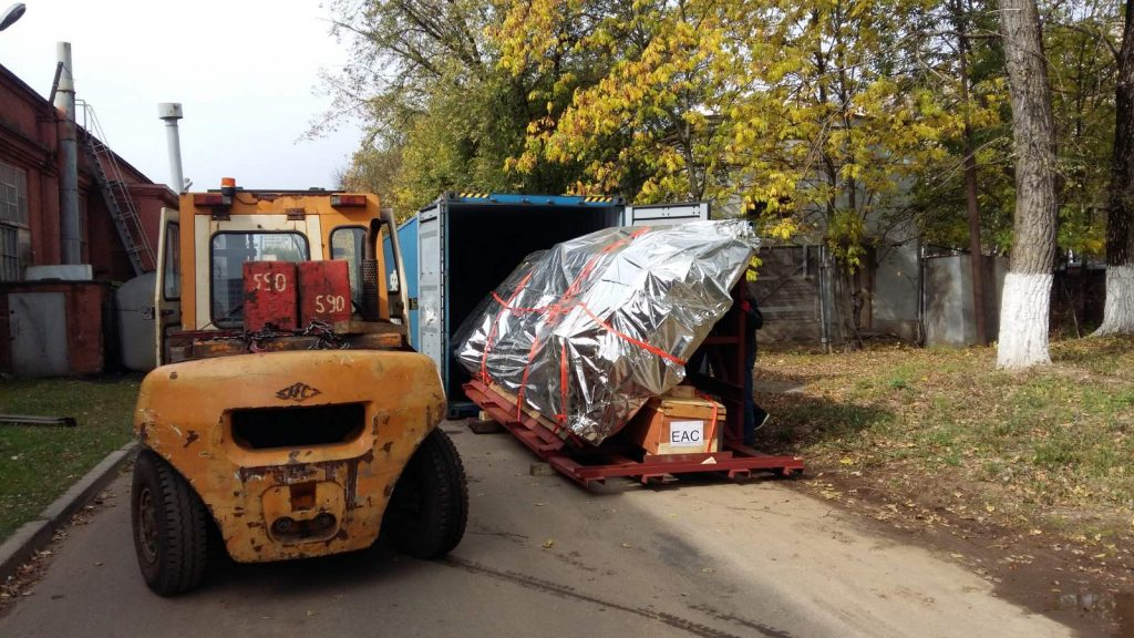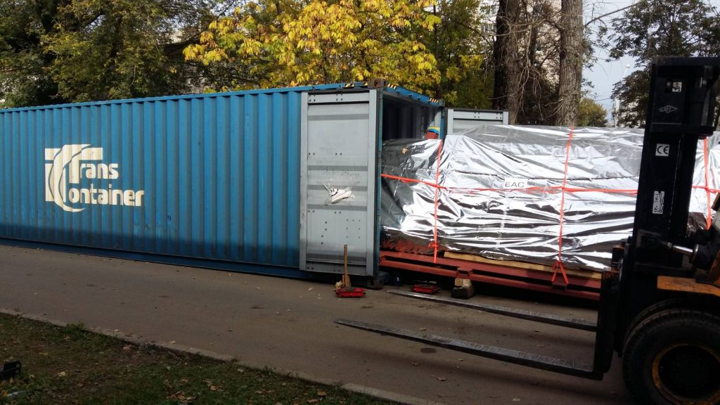 Выгрузка оборудования из морского контейнера, перемещение в цех с установкой.